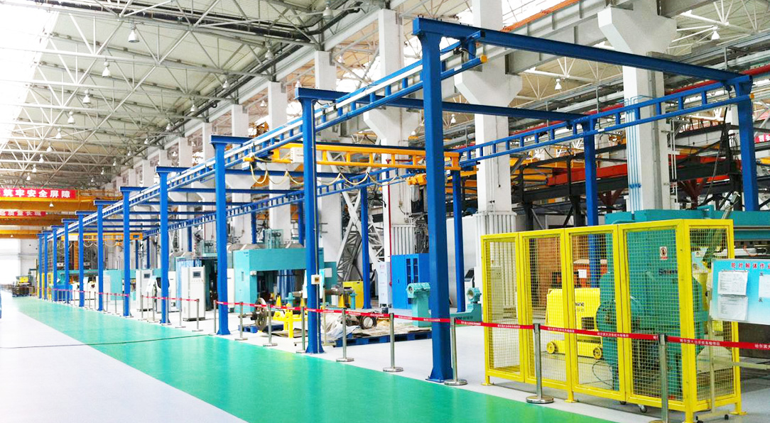 该生产线主要进行火车轮对检修、清洗、探伤、修复等。工位间距离紧凑,轮对搬运又需起重设备,厂房无法连续几个工位都配备行车,极大影响了客户的生产,并存在严重的安全隐患。孚尔特的解决方案:孚尔特组合式自立起重机,2吨起重量,多主梁,主梁长度6米,电动驱动方案,电动行走均为变频设计,运行平稳。为何选择孚尔特